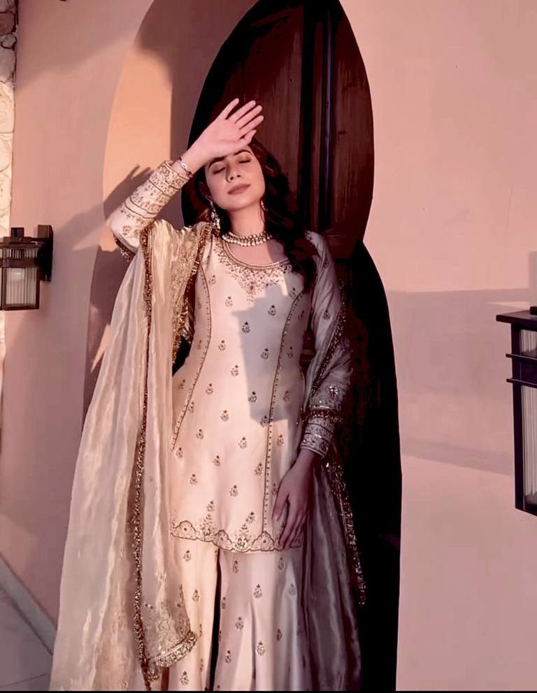 Designer White Colour Embroidery With Sequence Work Pure Satin Silk Sharara Suit